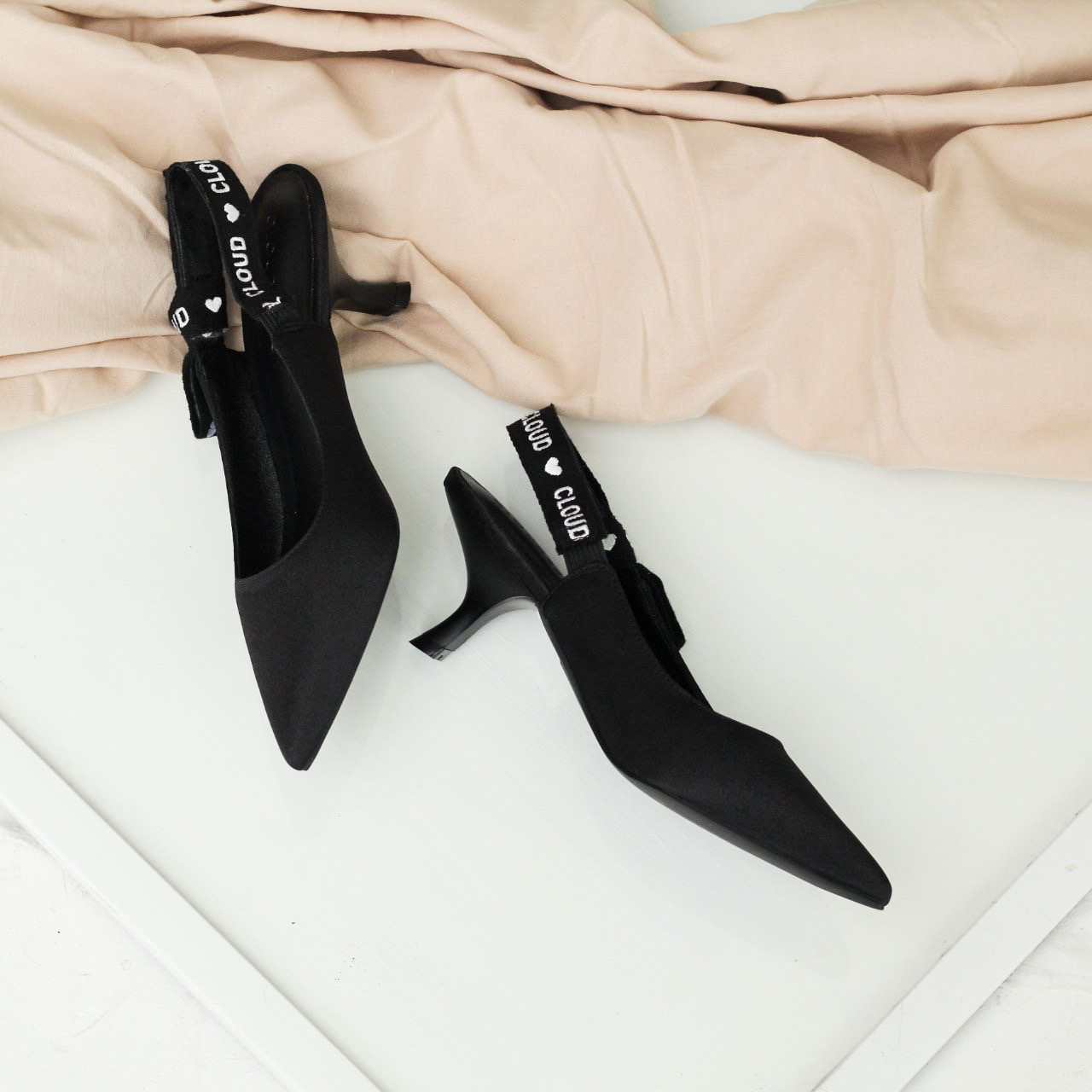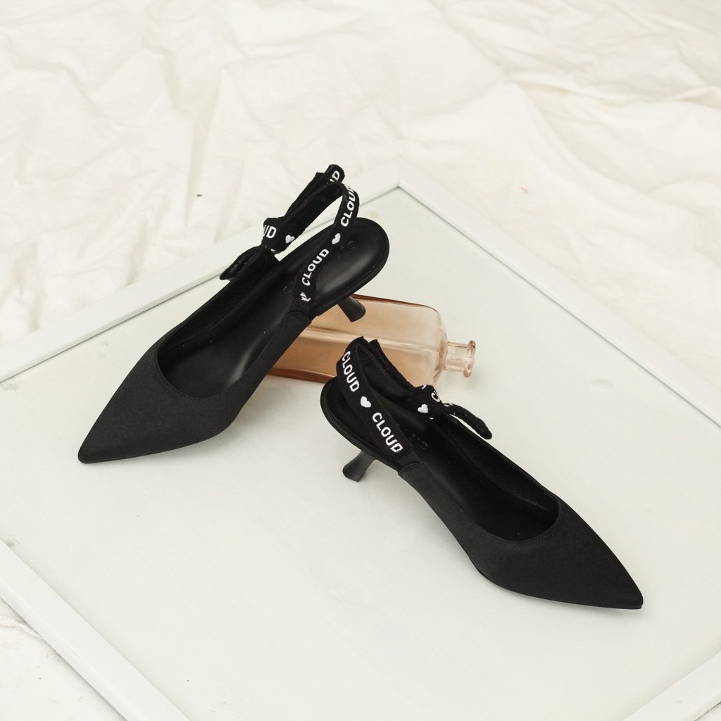 CLOUD Heels là sản phẩm có thiết kế bít mũi, gót cao 4cm, quai hậu ruy băng thêu chữ CLOUD tinh tế.